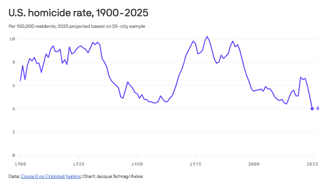 Last year's homicide rate may have been the lowest since 1900January 24, 2026CrimeSo reports Axios using data from the Council on Criminal Justice: